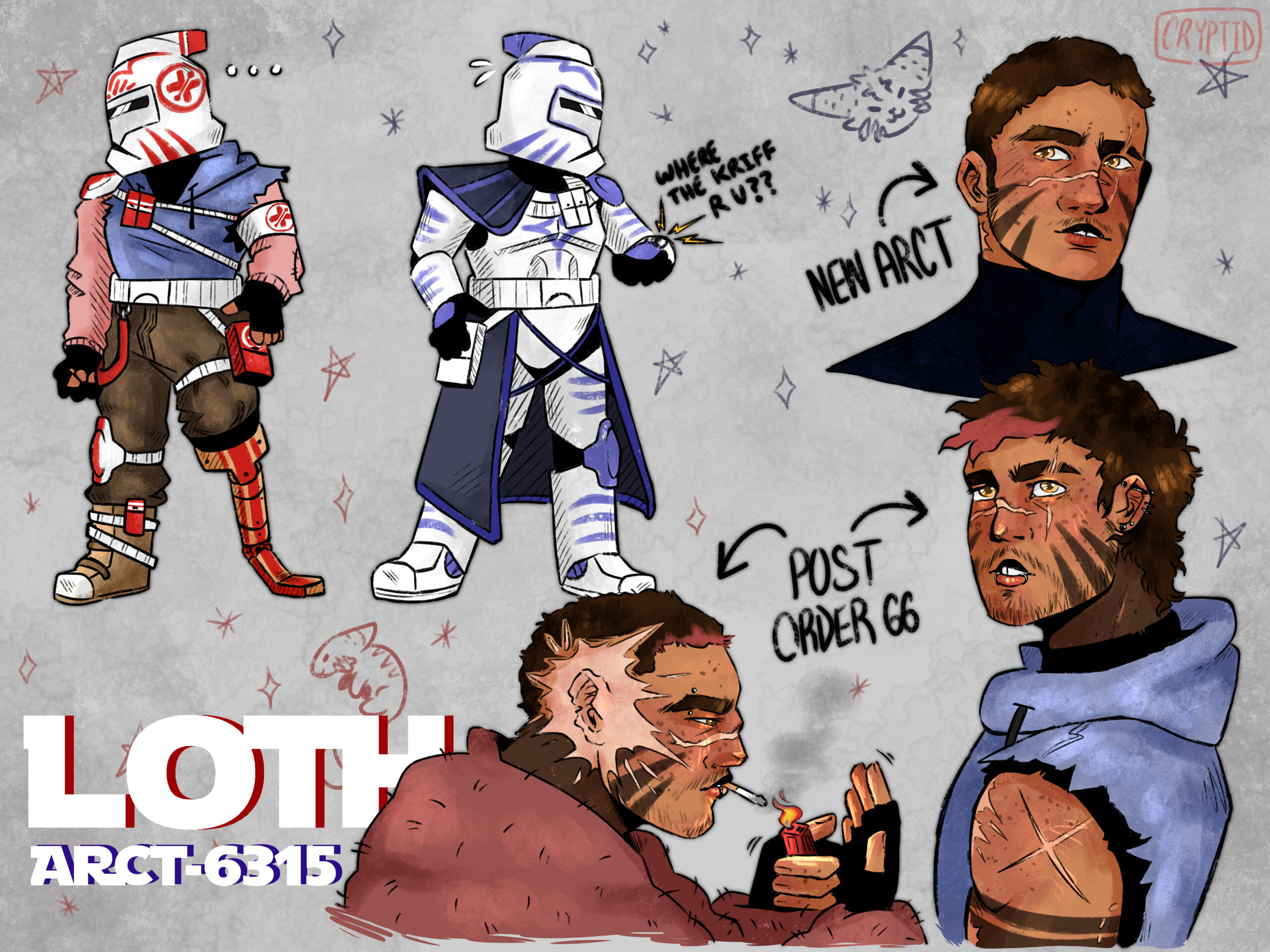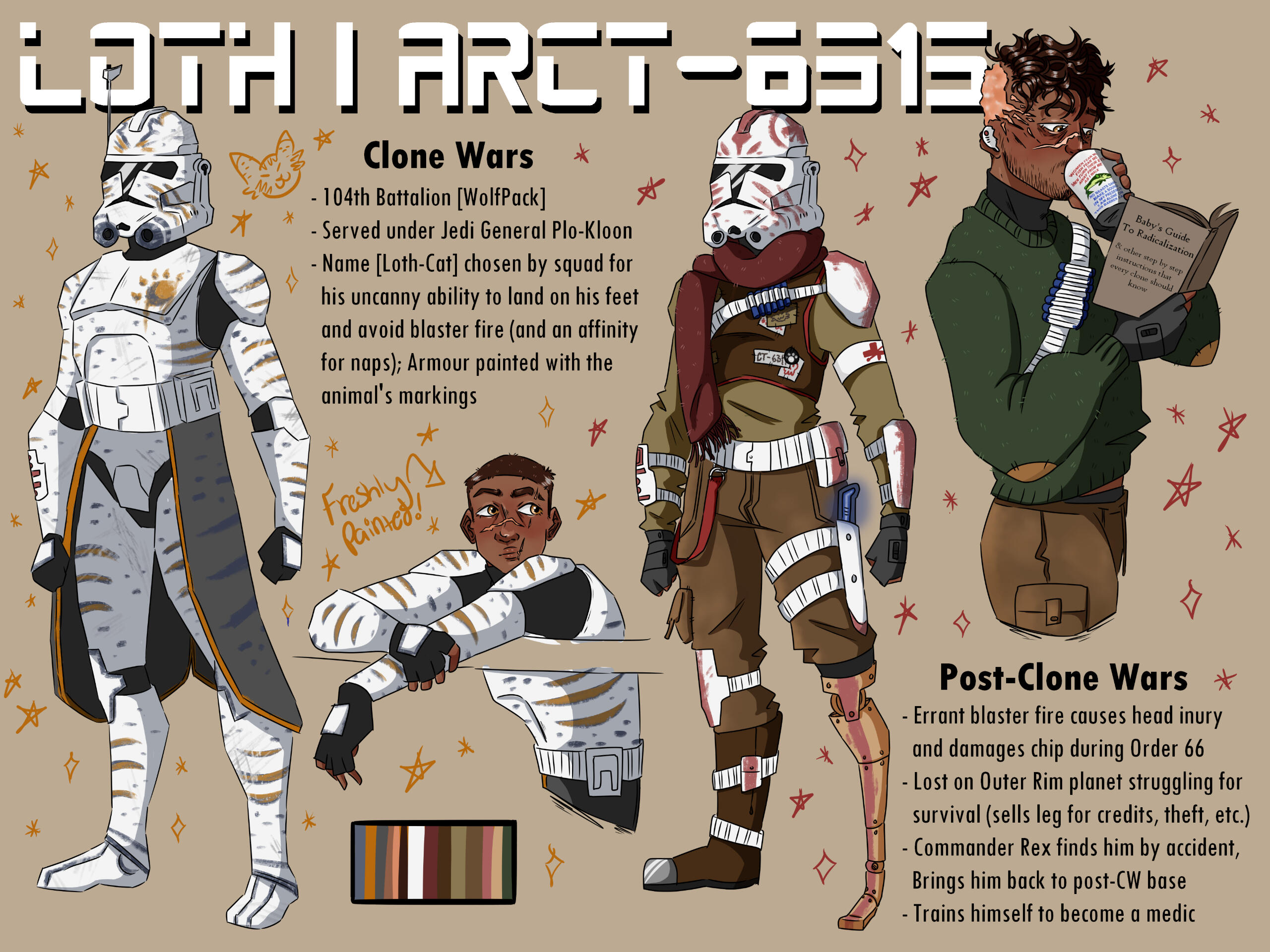 He is named Loth after he kept falling off of high places (which he kept climbing) and landing in his feet somehow. Also because more often than not one could find him napping in some square of sunlight or another on base whenever he had free time. This name is given by his batch brothers.He loses most of his squad in the 101st during The Battle (an unnamed conflict during the Clone Wars), and afterwards he trains to become an ARC, and is subsequently separated from his last remaining batch brother (Trip) in order to be placed with the 104th (not by choice).He enjoys sharing music with his brothers over their comms, and painting their armor together, though he is not actually that skilled of an artist. While introverted during the Clone Wars, able to use his squad as a social buffer, when he is alone for the second half of war he is forced to become more outgoing in order to fulfill his responsibilities as an ARC Trooper and so he doesn’t go mad from loneliness.